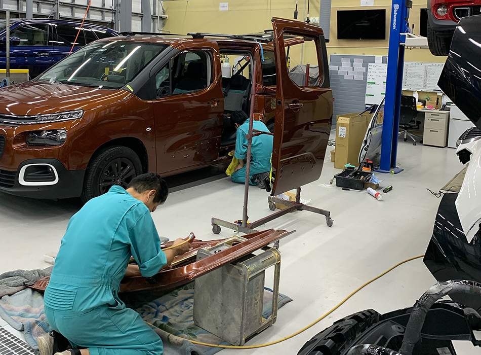 弊社の作業員は、各メーカーのトレーニングに参加し、認定資格を取得しております。高い技術力とメーカーに対する詳しい知識を持つ作業員が、お客様のお車を仕上げます!車種や修理の状態によって作業方法は様々です。今まで何台もの鈑金塗装を行ってきた経験豊富な作業員が、それぞれのお車にあわせた最適な作業を行います。